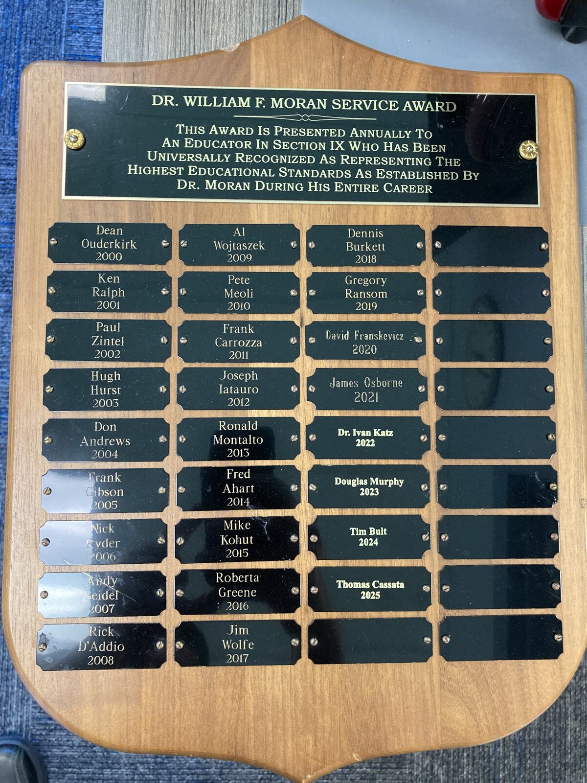 The award has never been given to the same person twice. It is presented to “an educator in Section 9 who has been universally recognized as representing the highest educational standards as established by Dr. Moran during his entire career.” Former Red Hook Athletic Director Andy Seidel, who Cassata succeeded in 2005, won the award in 2007.