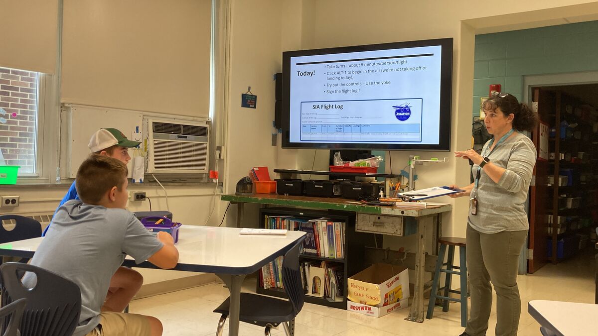 Melitski obtained a grant from The SIA Foundation, which stands for Students In Aviation, to purchase one simulator and the district purchased another. The nonprofit SIA Foundation, founded in 2016, has donated more than 100 simulators to schools across the country to fulfill its mission to “ignite a passion for aviation and aerospace” and introduce “students to the world of aviation. In addition to the grant, SIA helped Melitski set the equipment up and showed her the basics of how to fly.The teacher began passing along what she learned Wednesday. The Future Flyers club meetings started with Melitski walking the students through slides of how to operate the controls and they watched a video created by SIA. Then, they were free to explore the simulators, which consist of the controls – a yoke – rudder pedals and a large high-definition screen, giving students a clear view of what a pilot would see.