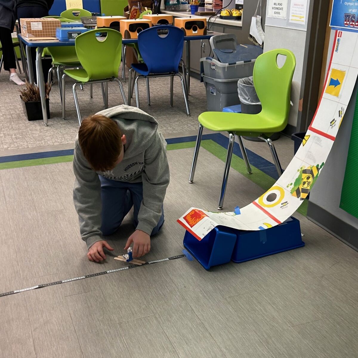 The students studied the concepts of friction, gravity and measurement by creating skiers to go down a miniature ski jump, and created ice hockey goals and sticks. Throughout both projects, STEAM teacher Sybil Bell said, the students discussed and put into use the engineering design process.